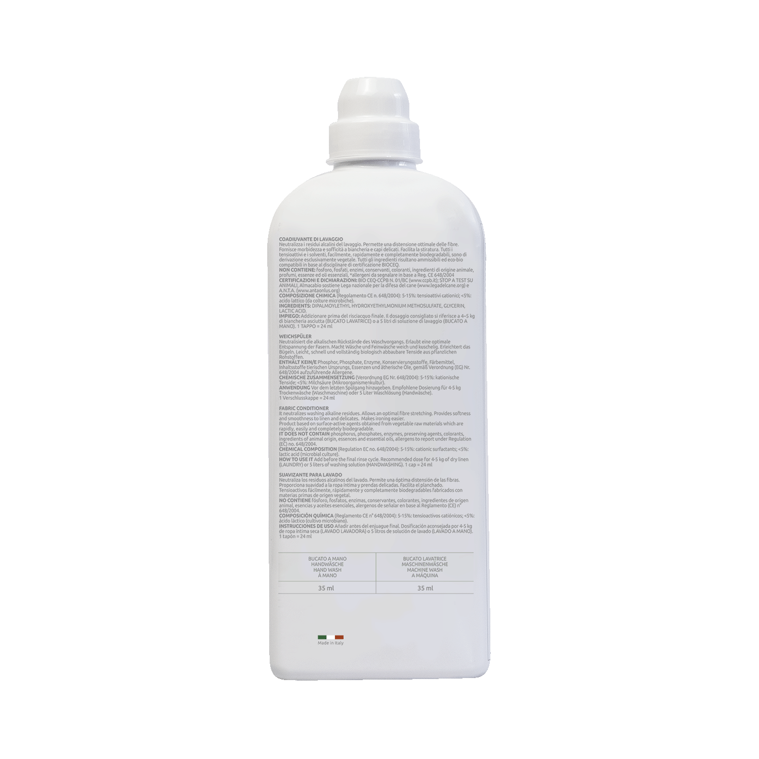 (Regolamento CE n. 648/2004): 5-15%: tensioattivi cationici; <5%: acido lattico (da colture microbiche).