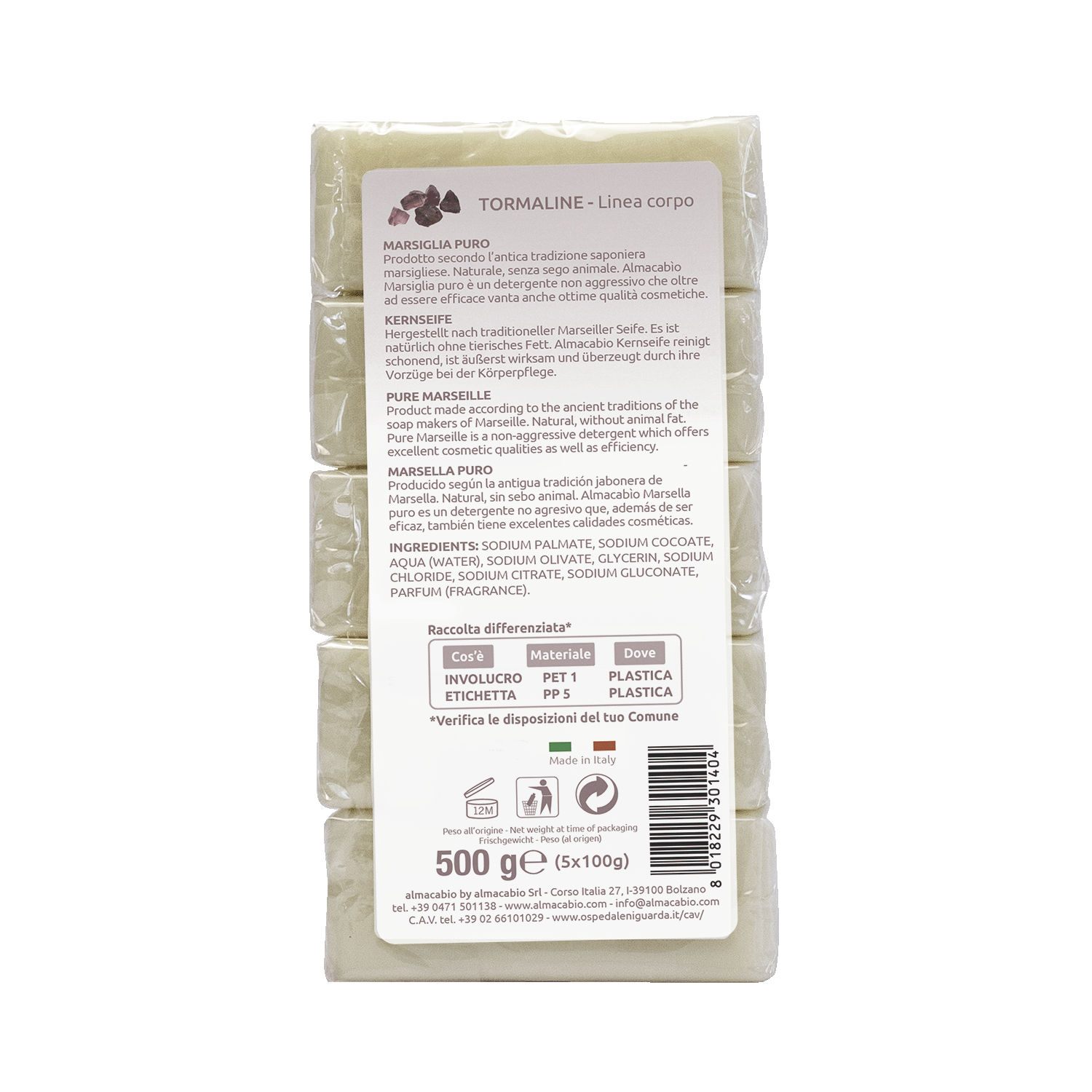 Prodotto seguendo l'antica ricetta del sapone di Marsiglia, Almacabio Marsiglia puro è un detergente non aggressivo naturale e senza sego animale. Oltre ad essere efficace vanta anche ottime qualità cosmetiche. Tutti i tensioattivi, facilmente, rapidamente e completamente biodegradabili, sono di derivazione esclusivamente vegetale. Tutti gli ingredienti risultano ammissibili ed eco biocompatibili in base al disciplinare di certificazione Bio C.E.Q.
