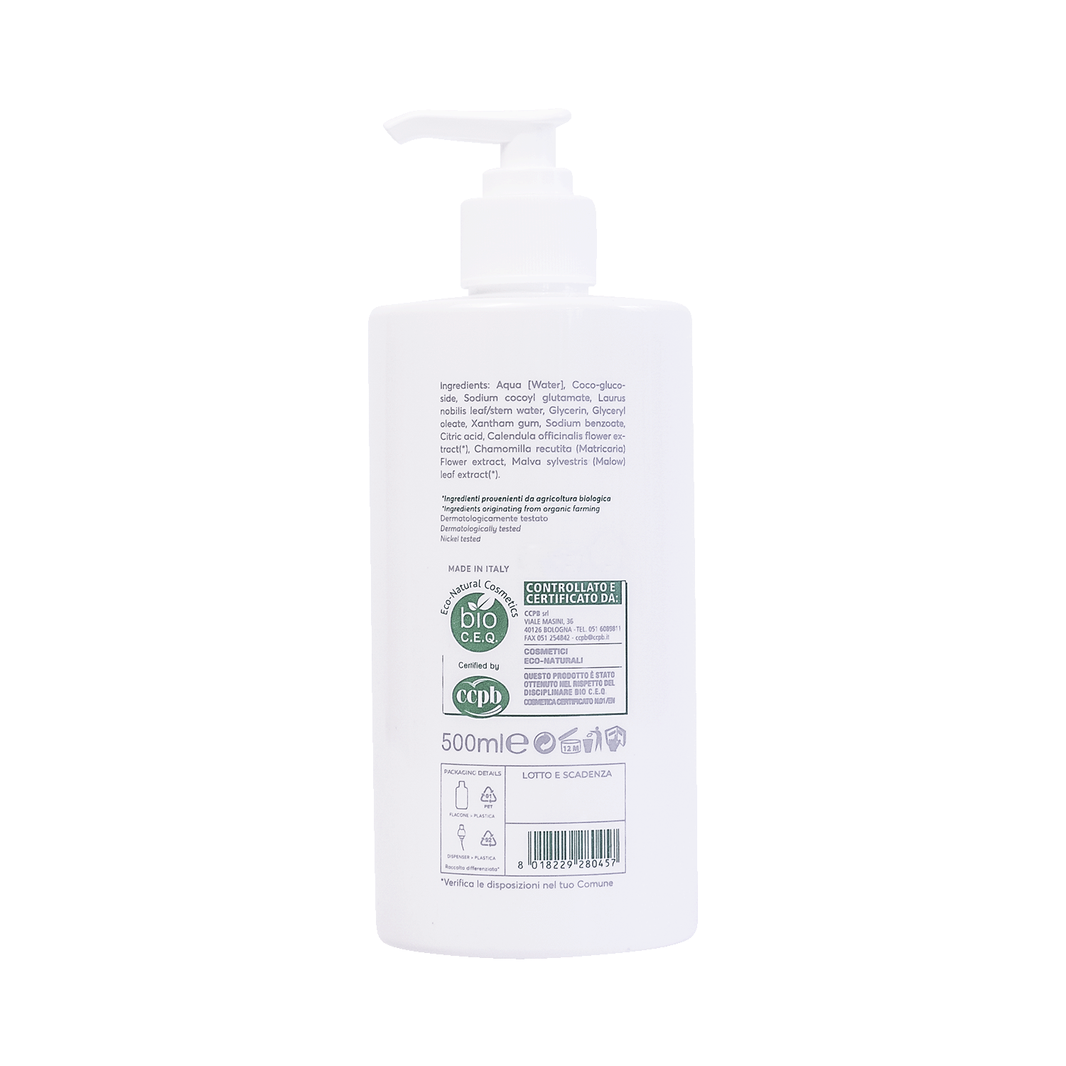 Aqua [water], Coco-glucoside, Sodium cocoyl glutamate, Laurus nobilis leaf/stem water, Glycerin, Glyceryl oleate, Xanthan gum, Sodium benzoate, Citric acid, Calendula officials flower extract(*), Chamomilla recutita (matriarca) flower extract, Malva sylvestris (mallow) leaf extract(*).